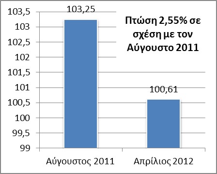 ο δείκτης τιμών τον Απρίλιο 2012 παρουσιάζει μείωση κατά 3,42% σε σχέση με τον Ιανουάριο 2010.