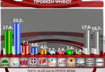 Στη δημοσκόπηση της ALCO για το «Πρώτο Θέμα» η ΝΔ προηγείται του ΠΑΣΟΚ με 5,8%, συγκεντρώνοντας 21,3%.