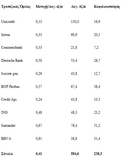 Η διαφορά μεταξύ λογιστικής και χρηματιστηριακής αξίας των τραπεζών είναι ένας δείκτης, ο οποίος εμφανίζει τα προβλήματα των τραπεζών – όπου συμπεραίνεται ότι, η θέση τους είναι τουλάχιστον τόσο άσχημη, όσο και το 2008. Οι δέκα μεγάλες τράπεζες της Ευρωζώνης διαπραγματεύονται κατά μέσον όρο στο 41% της λογιστικής τους αξίας – γεγονός που σημαίνει ότι, οι αγορές πιθανολογούν πως χρειάζονται διαγραφές απαιτήσεων ύψους 59% των κεφαλαίων τους ή 346,3 δις €.